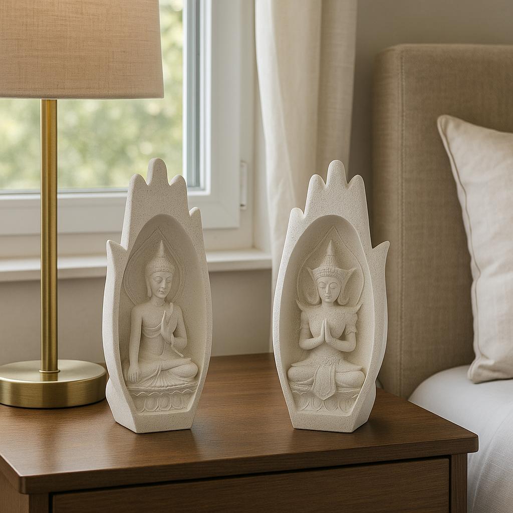 Diseño único: Esculturas con forma de manos abiertas conteniendo figuras de Buda sentado en posición meditativa.