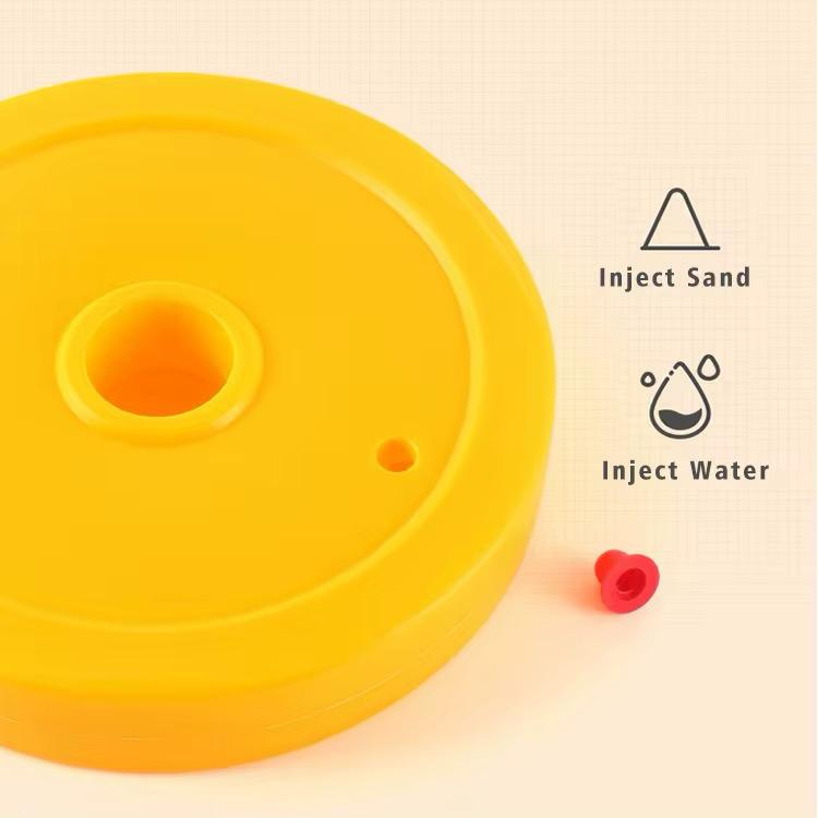 🔸 Pesas rellenable: Cada disco se puede rellenar con agua o arena para variar el peso, de acuerdo a la resistencia deseada.