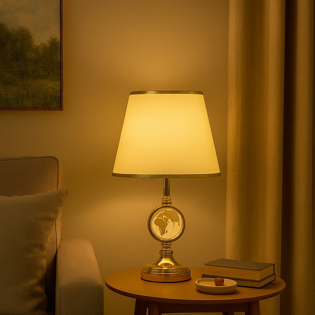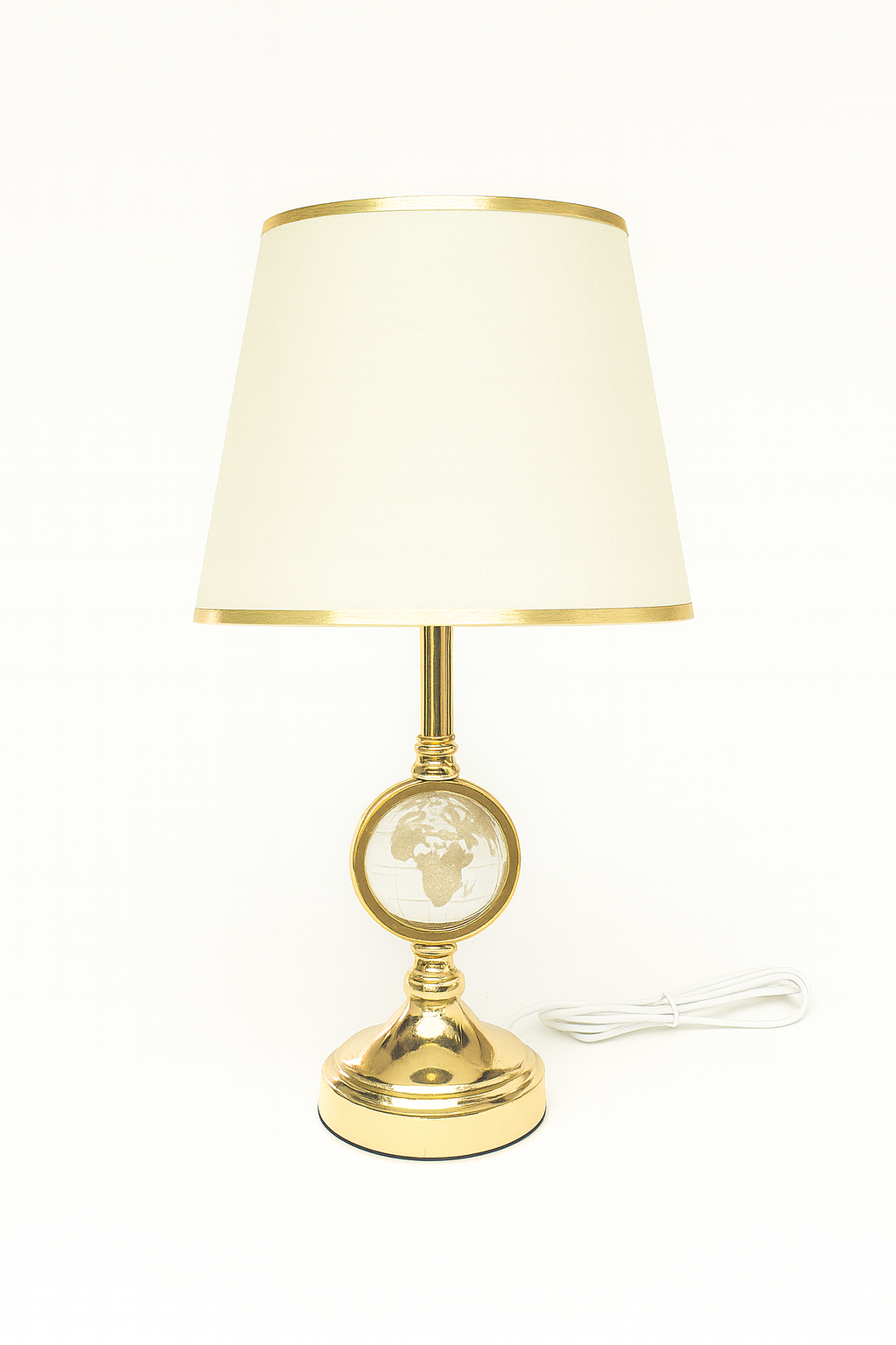 Ilumina tus espacios con elegancia y estilo con esta lámpara de mesa decorativa con esfera de planisferio, un diseño sofisticado que combina detalles dorados con una pantalla clásica en tono marfil.