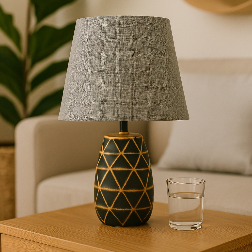 Su patrón geométrico realzado en dorado no solo aporta textura, sino también luz y elegancia, haciendo que esta lámpara sea el centro de atención en cualquier rincón de tu hogar.