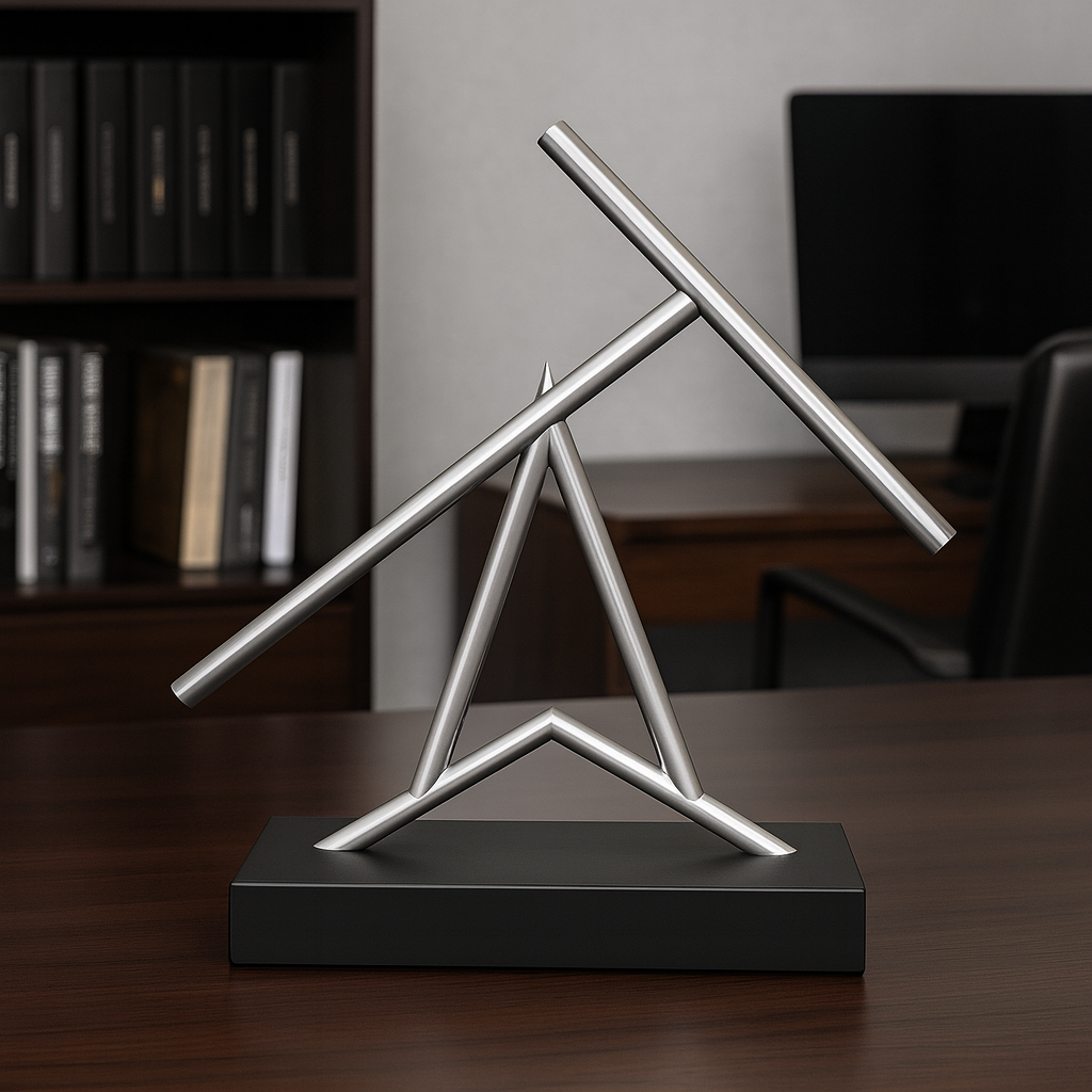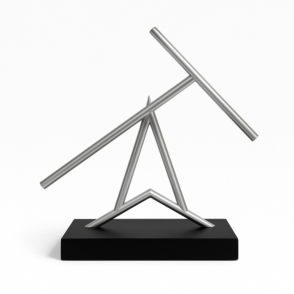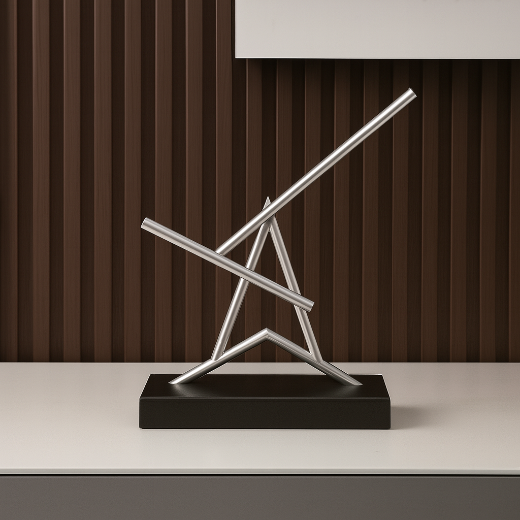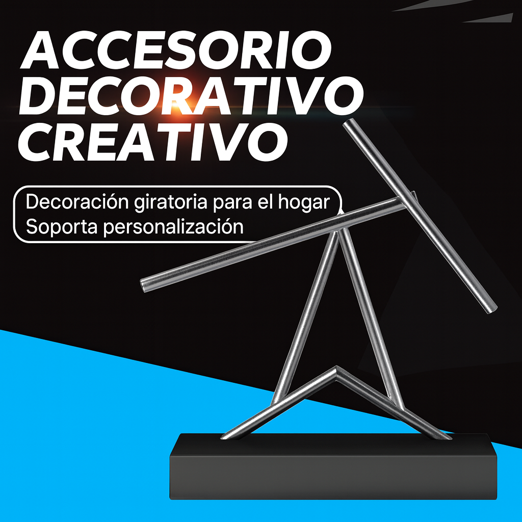 Su estructura metálica en acabado plateado y base sólida en negro lo convierten en una pieza única que combina arte y movimiento.
