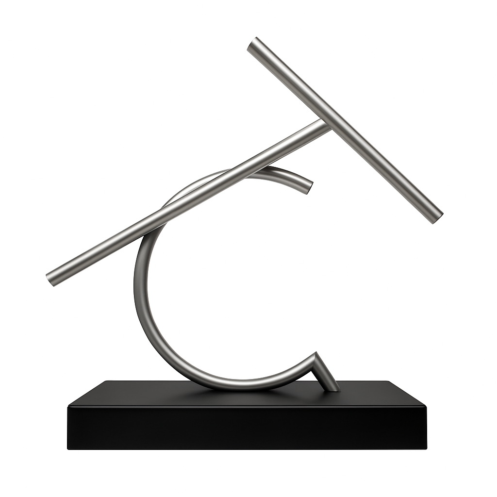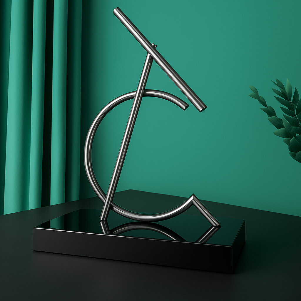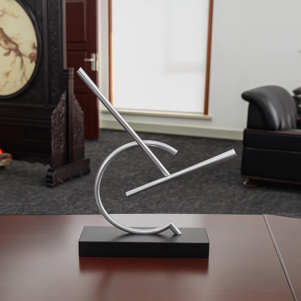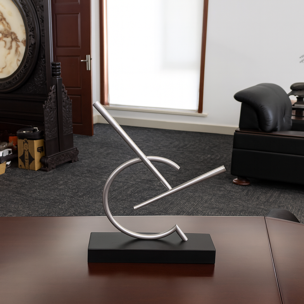 Dale un toque moderno y sofisticado a tus espacios con esta escultura abstracta de líneas geométricas, fabricada en metal de alta calidad y con acabado elegante en tono plateado.
